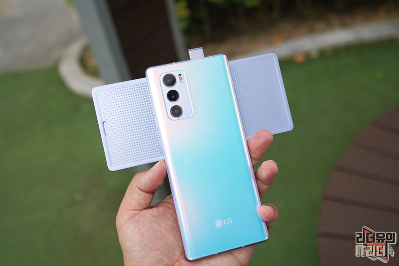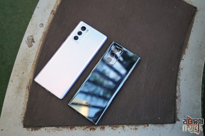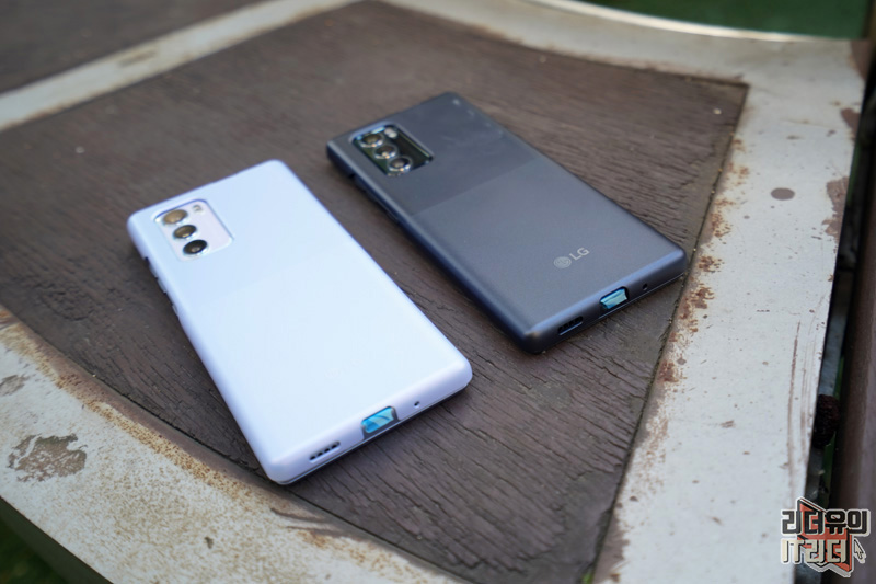뒷모습에서도 차이를 느낄 수 있는데요. LG 윙 일루전 스카이는 약간 보랏빛이 도는 컬러와 도트 무늬로 투톤의 느낌을 살리고 있고 LG 윙 오로라 그레이는 무광으로 처리해 무광과 유광의 조합을 느낄 수 있습니다.
