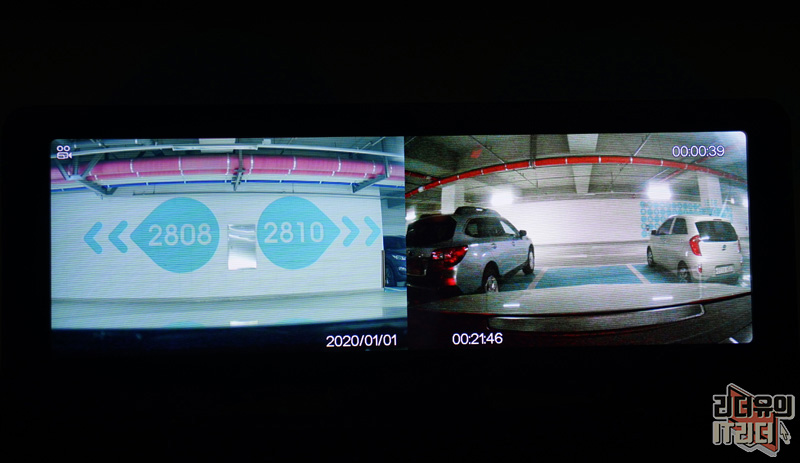 지하주차장에서의 전방카메라와 후방카메라 차이입니다. 어두운 곳에 오면 올 수록 전방 카메라의 놀라운 능력을 경험하게 됩니다. 후방 카메라 품질도 어느정도 빛이 있는 곳에서는 우수한 화질을 볼 수 있습니다.