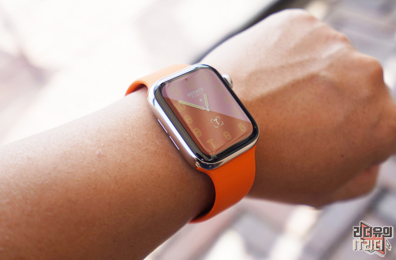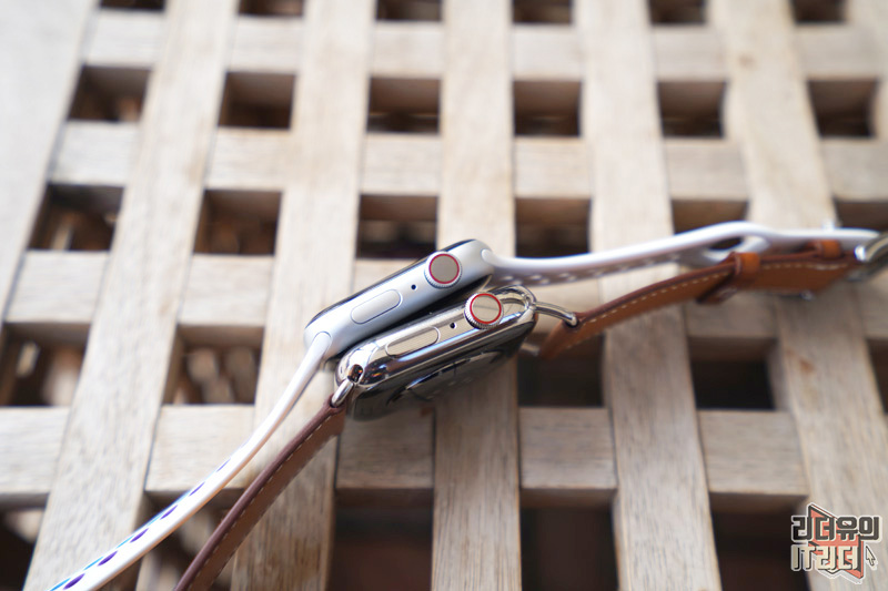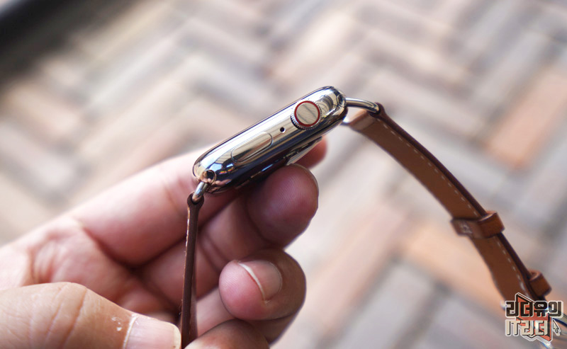옆에서 보는 테두리 소재 차이가 느껴지시죠? 참고로 일반 애플워치 시리즈6 스테인리스 스틸 케이스 44mm 모델 가격은 959,000원 부터 시작합니다. 가죽 밴드 차이, 특별한 에르메스 워치페이스를 생각하면 에르메스 모델이 비싼 제품이 아닙니다.
