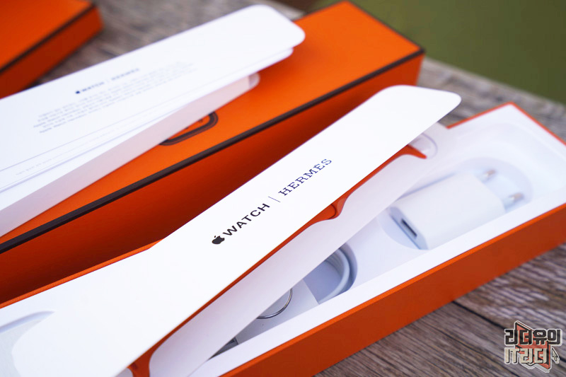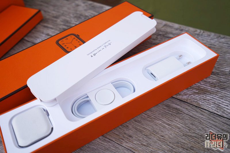 기본 구성품으로 충전 마그네틱 케이블과 전원 어댑터가 제공됩니다. 참고로 애플워치 시리즈6 일반 모델은 환경을 고려해 전원 어댑터가 빠졌는데 애플워치 시리즈6 에르메스에는 포함되어 있습니다.