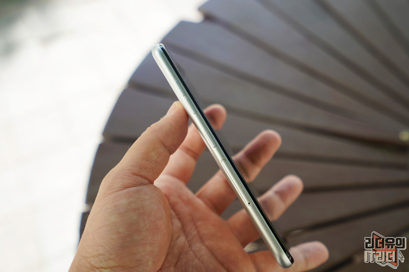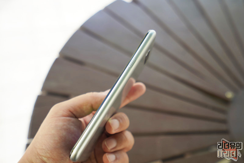 LG Q31 오른쪽 면에는 전원/홀드 버튼이 있습니다. 그리고 옆라인을 보면 인상적인 부분이 후면까지 하나로 이어지는 라인을 보여주고 있다는 것입니다. 유니바디 디자인으로 깔끔한 매력을 느낄 수 있습니다.