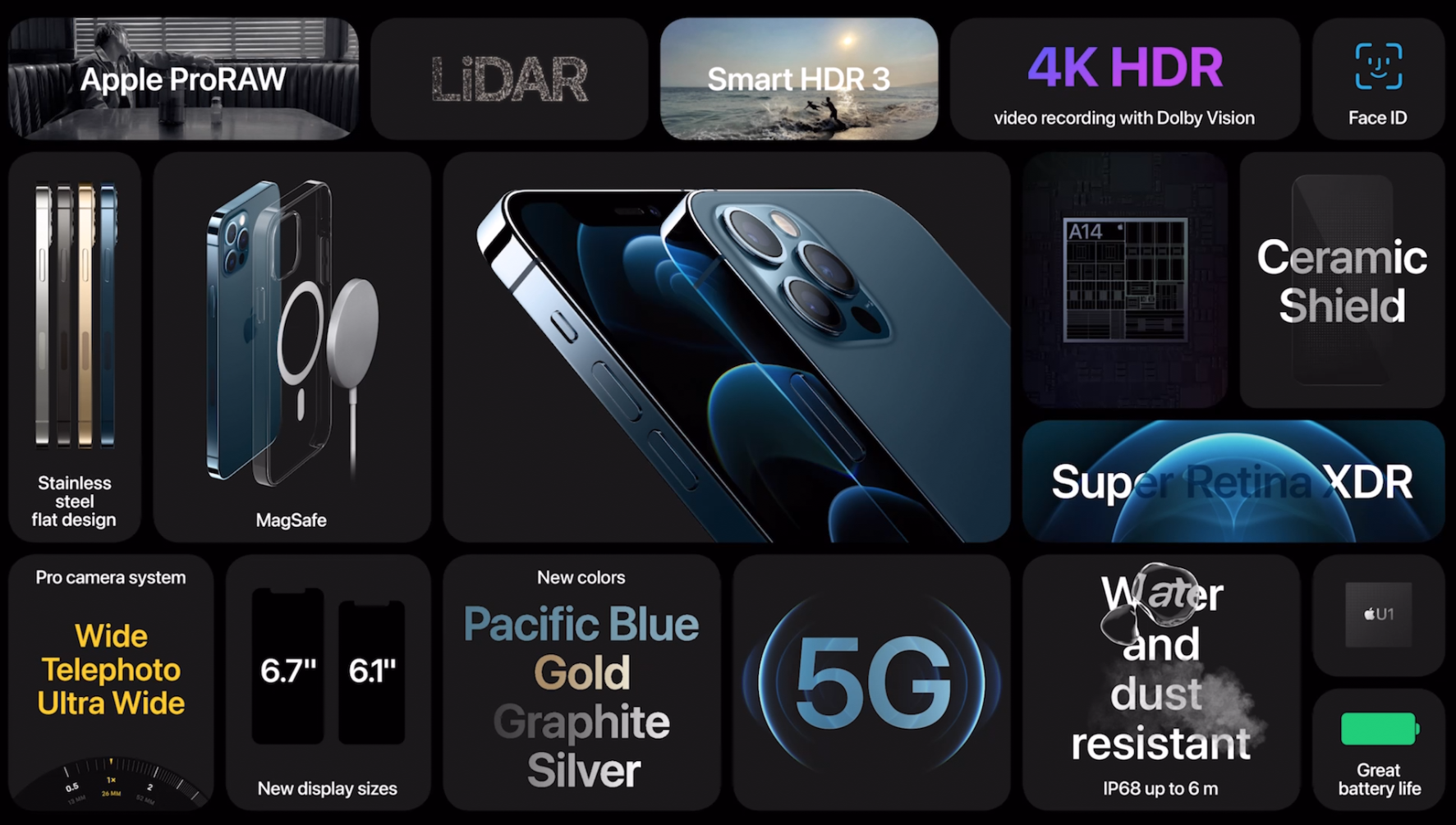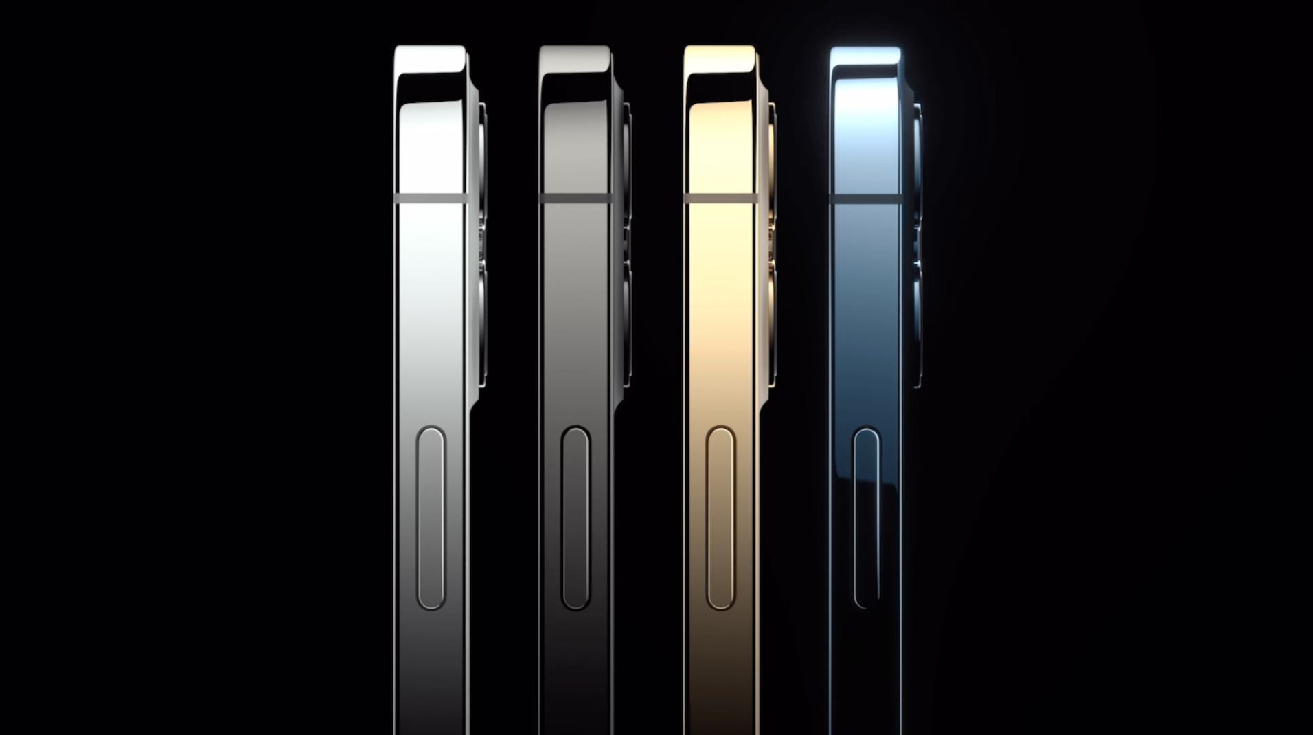 아이폰12 프로와 아이폰12 프로 맥스는 그래파이트, 실버, 골드, 퍼시픽 블루 색상으로 준비되어 있습니다. 후면을 처리한 느낌도 아이폰12, 아이폰12는 반짝이는 글라스 효과이고 아이폰12 프로와 맥스는 무광으로 표현되어 있어 색상과 컬러감에서 다른 모습을 보여주고 있습니다. 블루 색상도 퍼시픽 블루라고 해서 다른 느낌을 주기 때문에 서로 다른 개성을 확실히 보여주고 있습니다.