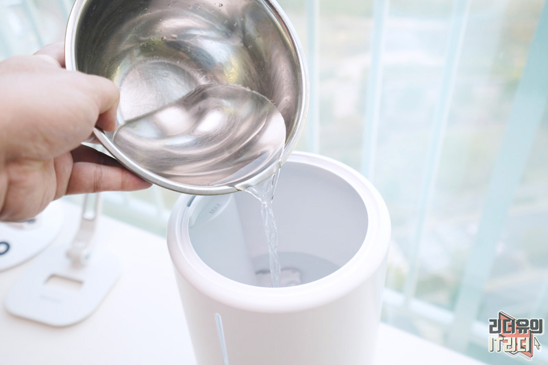안쪽 깊숙하게 물탱크가 있습니다. 4.5L 용량이라 여유로운 사용을 할 수 있어 좋습니다. 4.5L 가늠이 되시나요? 1리터 패트병이 4개하고도 반이 들어갑니다. 저용량 가습기들이 예쁘긴 하지만 물을 자주 갈아줘야 되는 번거로움이 있는데 대용량 가습기는 그런 불편함이 없어서 좋습니다. 물을 채우면 약 12~15시간 동안 사용할 수 있습니다.