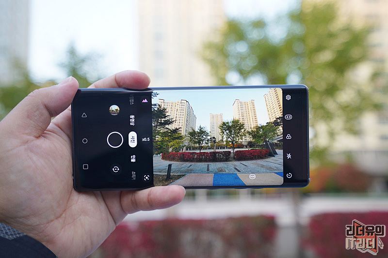 LG 윙은 화면을 돌리지 않고 일반적인 카메라 사용을 할 수 있습니다. 보통의 스마트폰에서 사용하듯 망원, 광각, 초광각을 선택해 사진, 동영상 촬영을 할 수 있습니다.