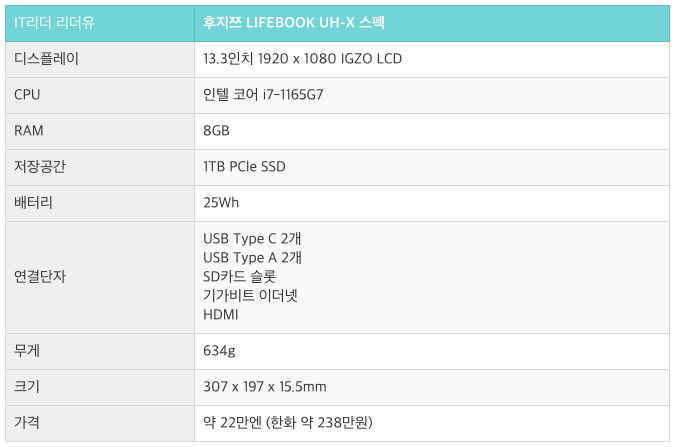 후지쯔 LIFEBOOK UH-X 스펙은 나쁘지 않습니다. 다만 배터리 25Wh로 낮아서 실사용 시간이 얼마나 될지가 관건입니다. 배터리 용량을 작게 가져가면서 무게를 낮춘 노트북이니 충전에 대한 상황을 고려해서 사용해야 할 것 같습니다.
