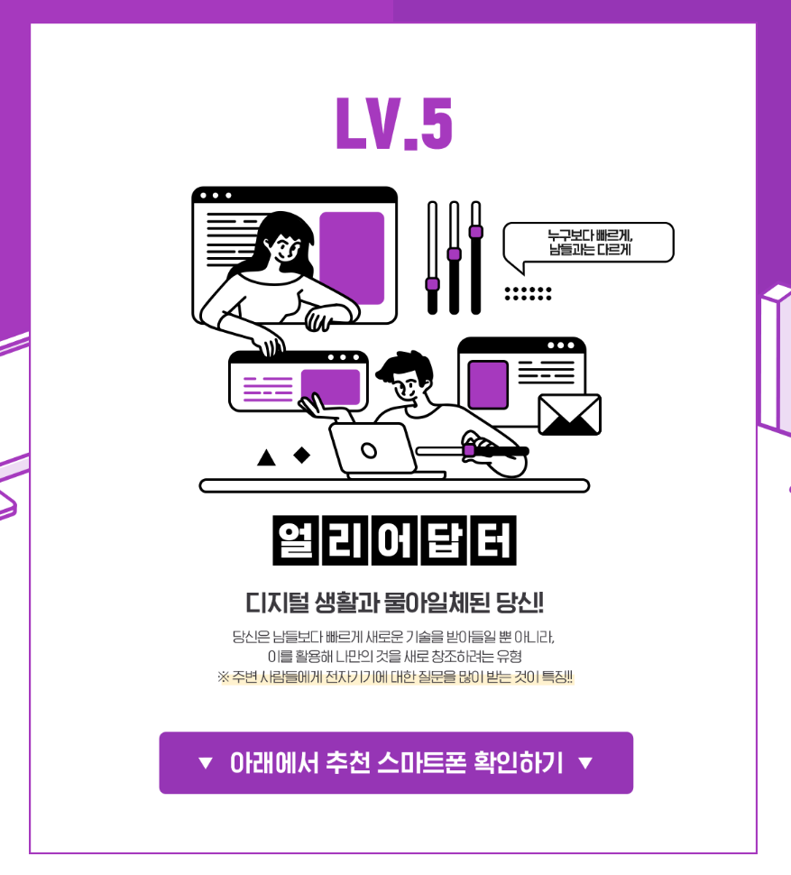저는 가장 높은 레벨 5가 나왔습니다. 얼리어답터로 평가 받았고 저의 레벨에 맞는 최신의 스마트폰이 추천되었습니다.