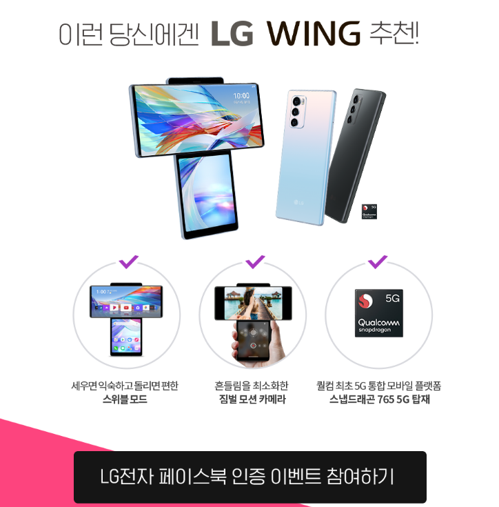 개성 만땅인 LG 윙일까요? 아니면 다른 스마트폰 중 뭐가 선택이 될까요? 가볍게 이벤트 참여하시고 여러분과 잘 어울리는 스마트폰도 매칭해 보시면 좋을 것 같습니다.