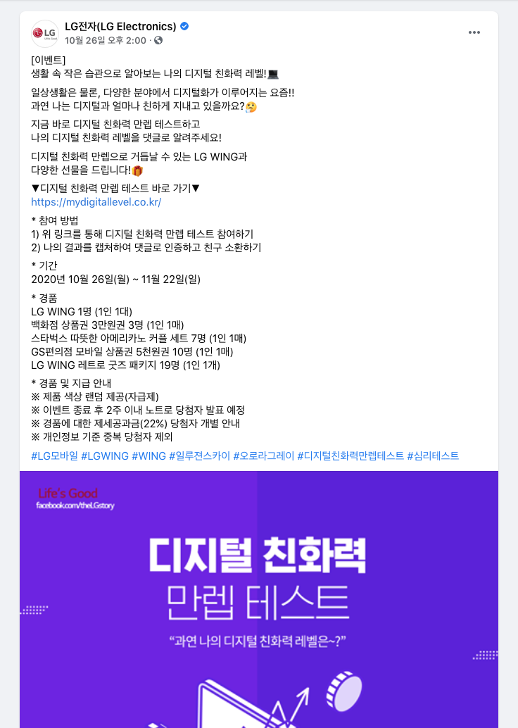 디지털 친화력 만렙 테스트를 하고 LG전자 페이스북 인증 이벤트에 참여하면 푸짐한 경품을 받을 수 있습니다. LG 윙 1대, 백화점 상품권 3만원권 3명, 스타벅스 아메리카노 커플 세트 7명, GS편의점 모바일 상품권 5000원권 10명, LG 윙 레트로 굿즈 패키지 19명으로 추첨 인원도 많습니다. 가능성 높은 이벤트이니 주저하지 마세요~
