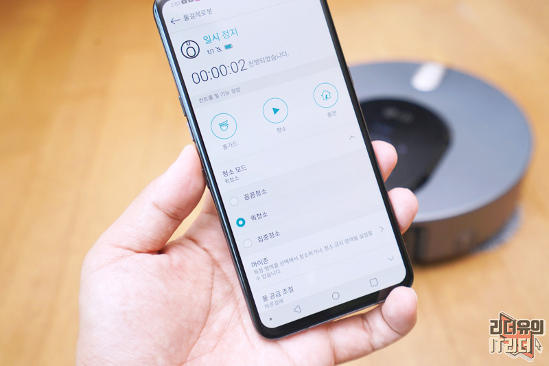 물 공급 단계는 최강, 강, 중, 약, 마른걸레로 선택 가능하고 최강과 중 모드의 경우는 LG ThinQ 앱을 통해서만 컨트롤 가능하니 참고해 두시기 바랍니다.