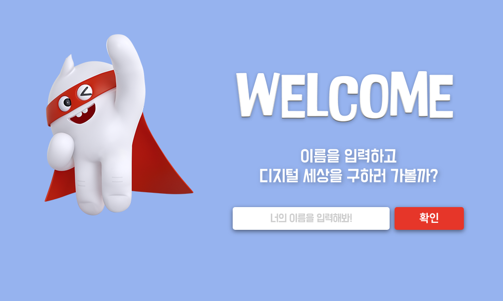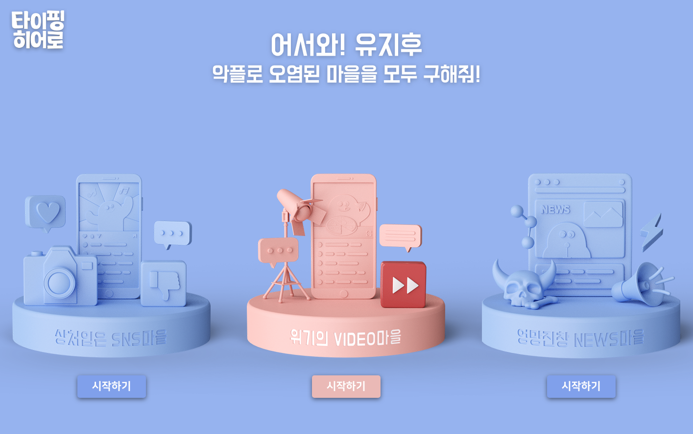 타이핑 히어로는 이름을 입력하고 상처입은 SNS 마을, 위기의 VIDEO 마을, 엉망진창 NEW 마을로 모험을 떠나게 됩니다. 온라인 속에서 만날 수 있는 이슈들을 마을로 묶어 아이들의 이해도를 높이고 있습니다.