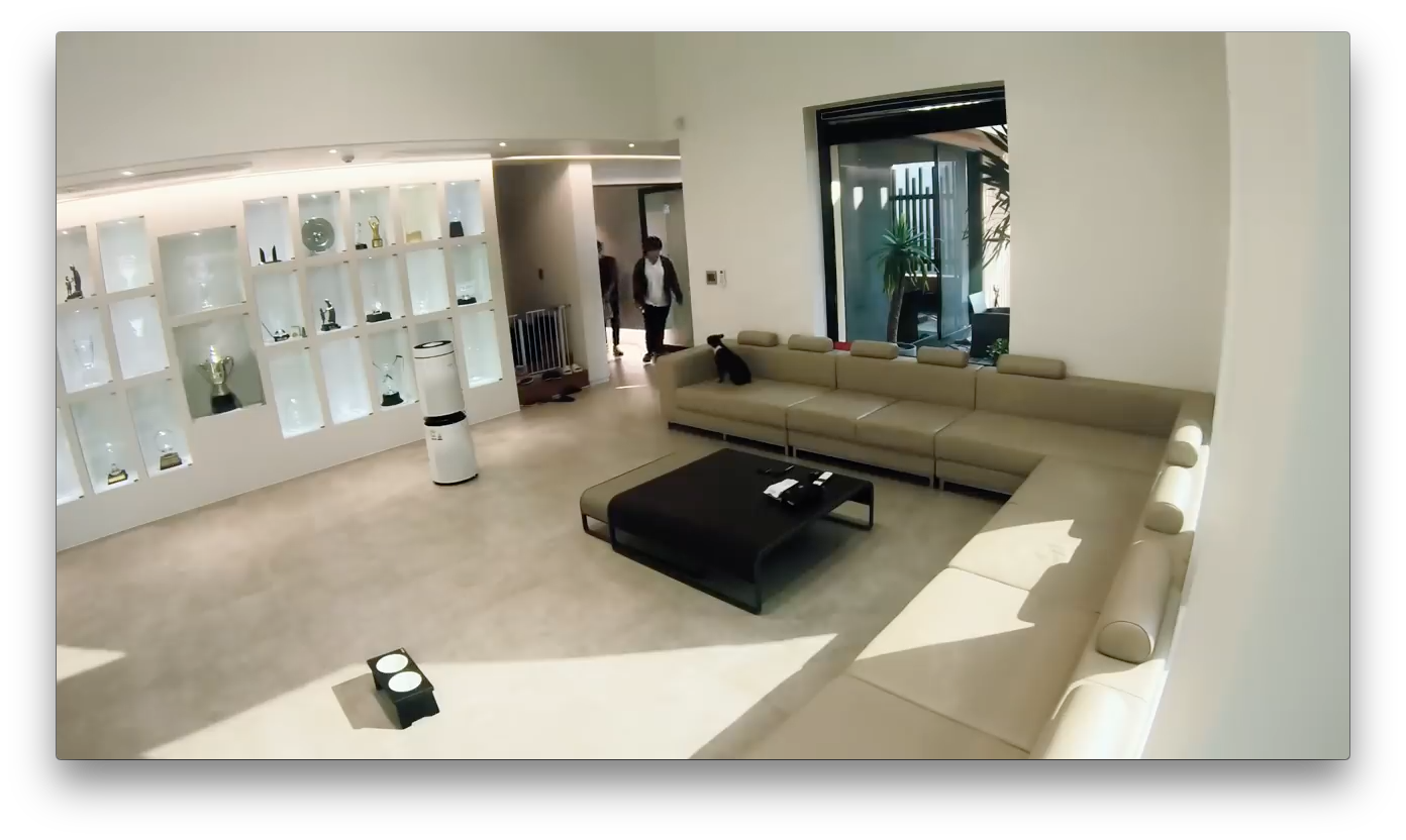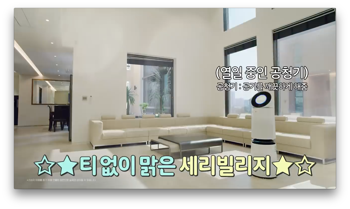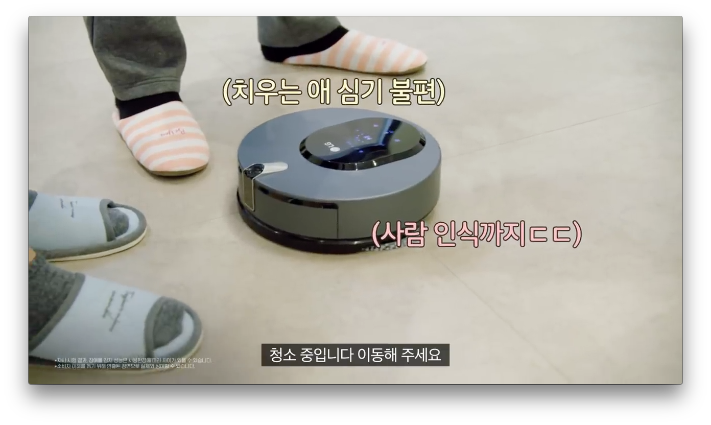 중간에 깨알같이 LG 로봇청소기의 특별한 기능을 보여줍니다. 사람이 길을 막고 있으면 청소 중이라고 비켜 달라고 합니다. 스마트한 LG 로봇청소기 입니다.