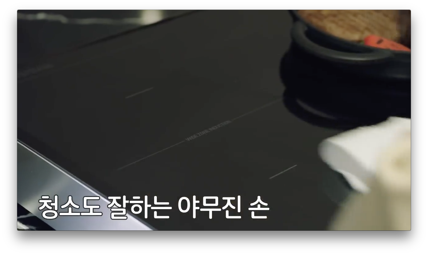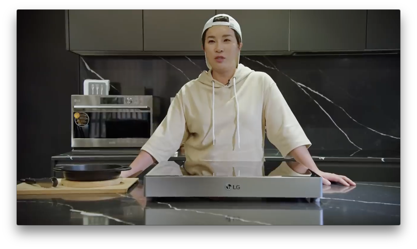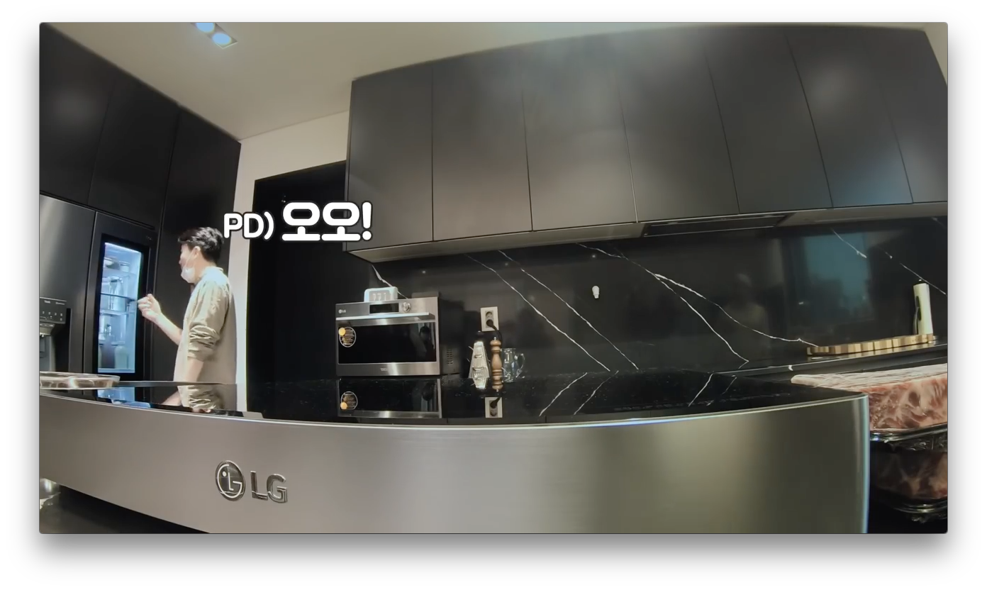 2편에서는 쿡방으로 주방 가전의 모습을 다양하게 보여줬습니다. LG DIOS 인덕션과 뒤쪽에 LG DIOS 광파오븐이 있는 것을 알 수 있습니다.