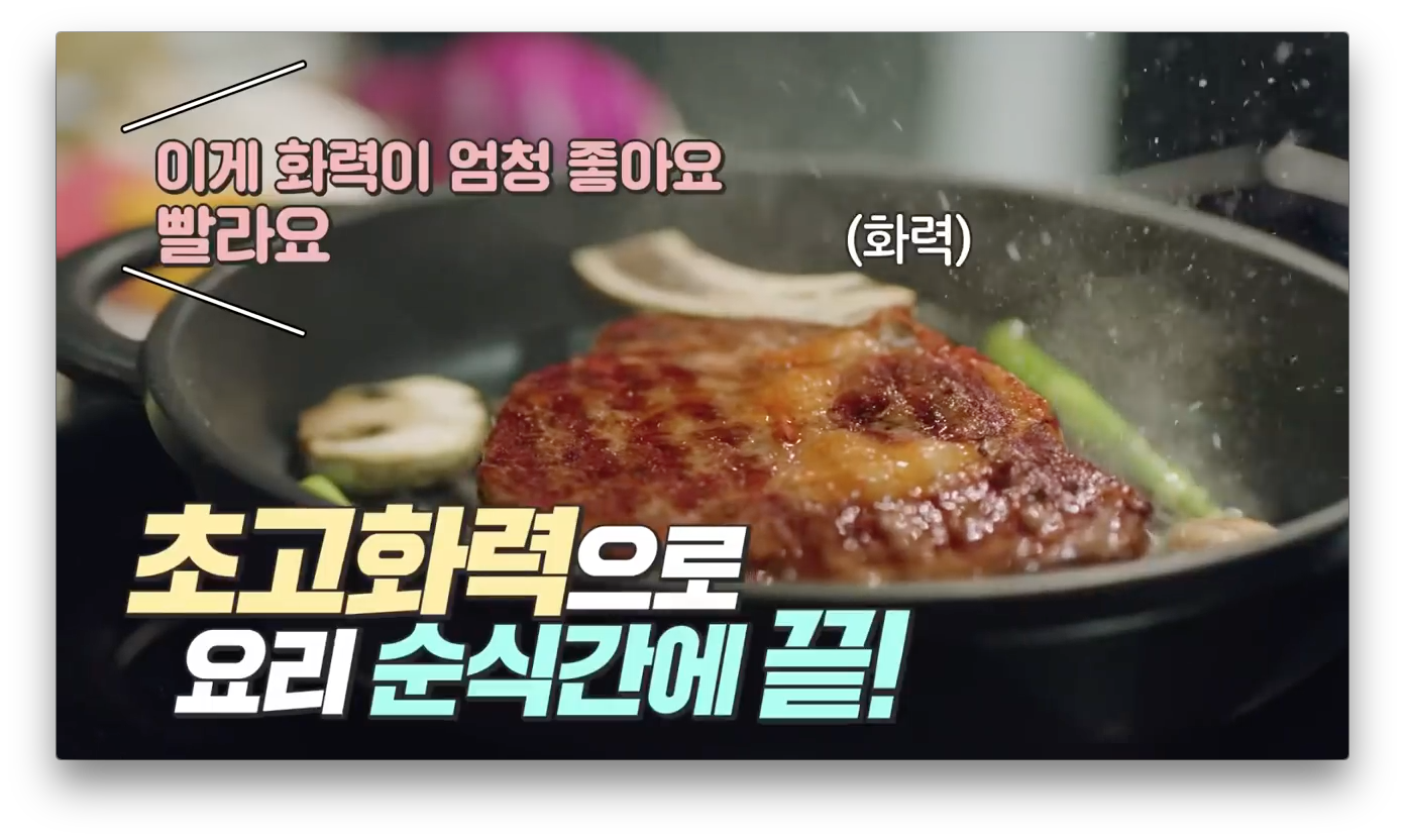 2편에서는 쿡방으로 주방 가전의 모습을 다양하게 보여줬습니다. LG DIOS 인덕션과 뒤쪽에 LG DIOS 광파오븐이 있는 것을 알 수 있습니다.
