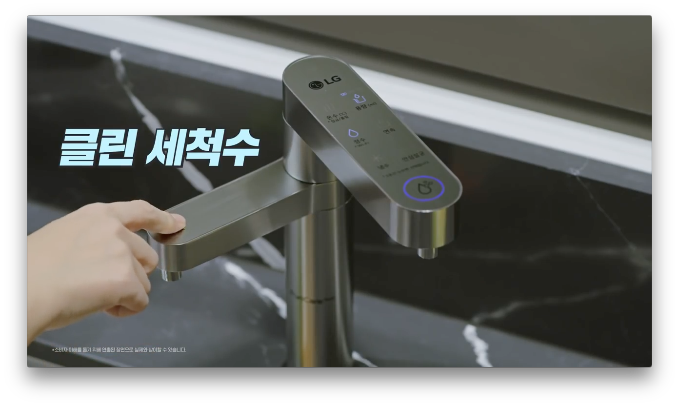 LG 듀얼 정수기의 모습입니다. 식재료를 씻을 때 클린 세척수를 사용하는 모습! 디자인도 멋지고 사고 싶네요