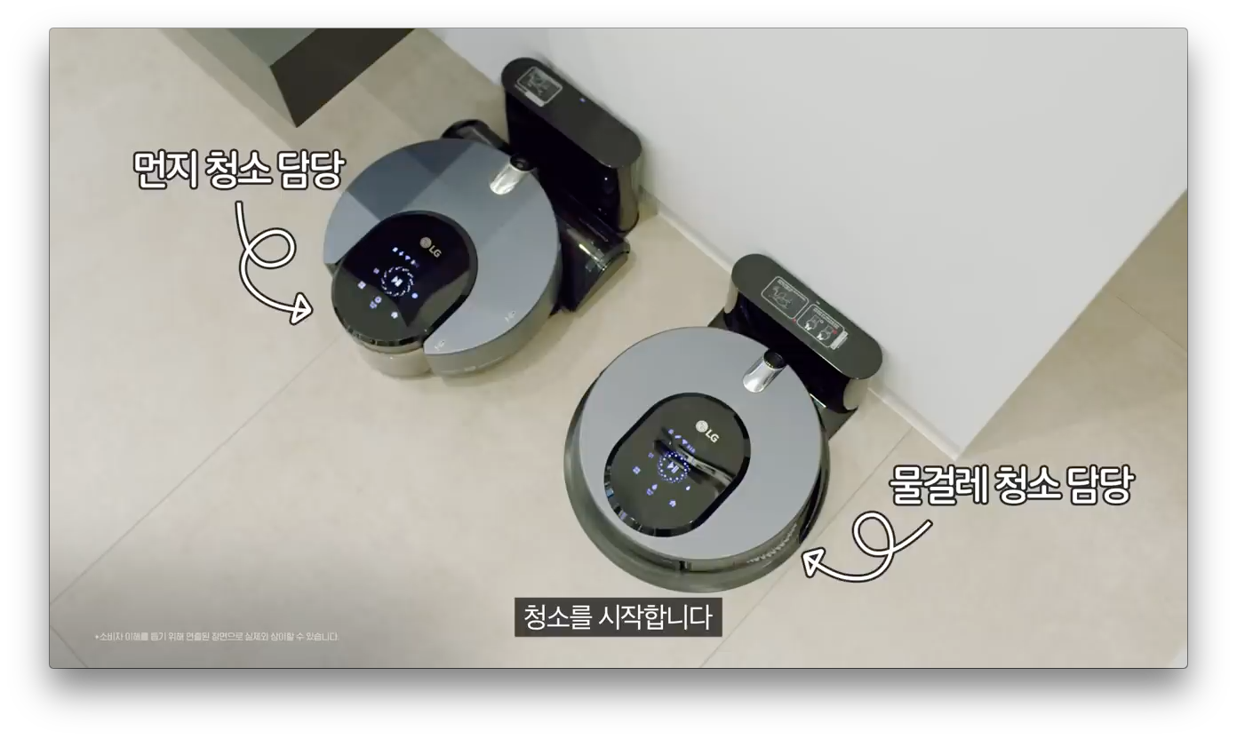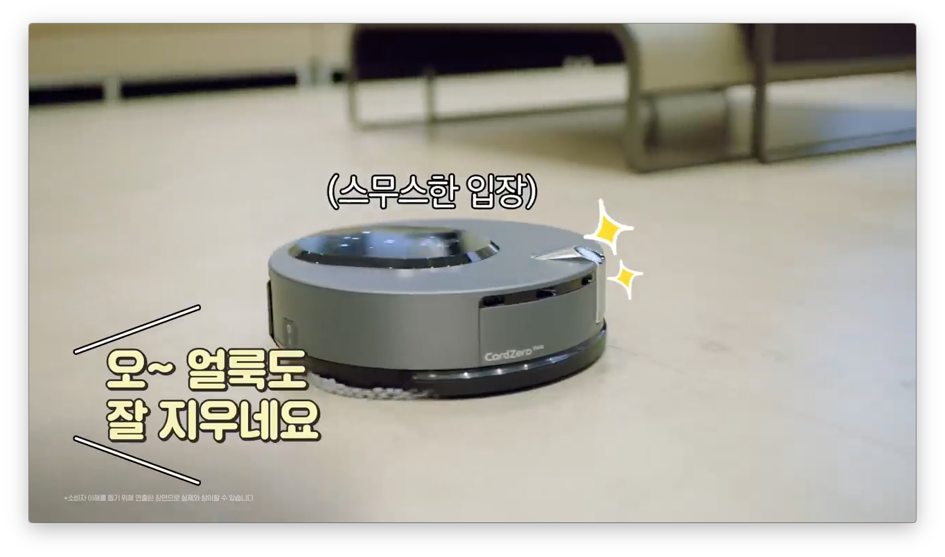 중간에 깨알같이 LG 로봇청소기의 특별한 기능을 보여줍니다. 사람이 길을 막고 있으면 청소 중이라고 비켜 달라고 합니다. 스마트한 LG 로봇청소기 입니다.