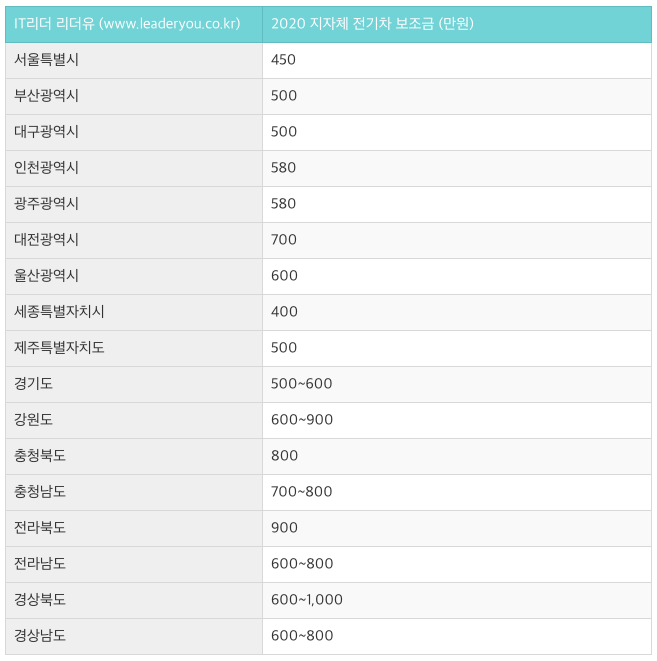차종별 전기차 구매 보조금 입니다. 정부 보조금은 배터리 효율이 좋으면 보조금이 더 나오는 구조인데요. 2021년에는 고가의 수입 전기차의 경우는 보조금 혜택을 줄인다는 계획도 있으니 참고하시기 바랍니다. 그리고 지자체별로 전기차 보조금이 또 나오는데요. 2020 지자체 전기차 보조금은 다음과 같습니다.