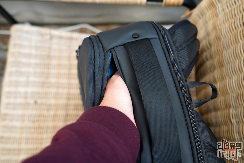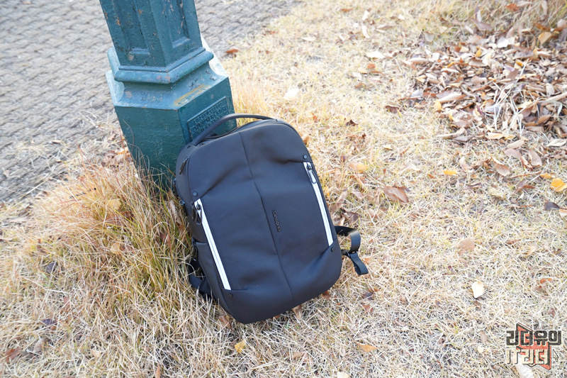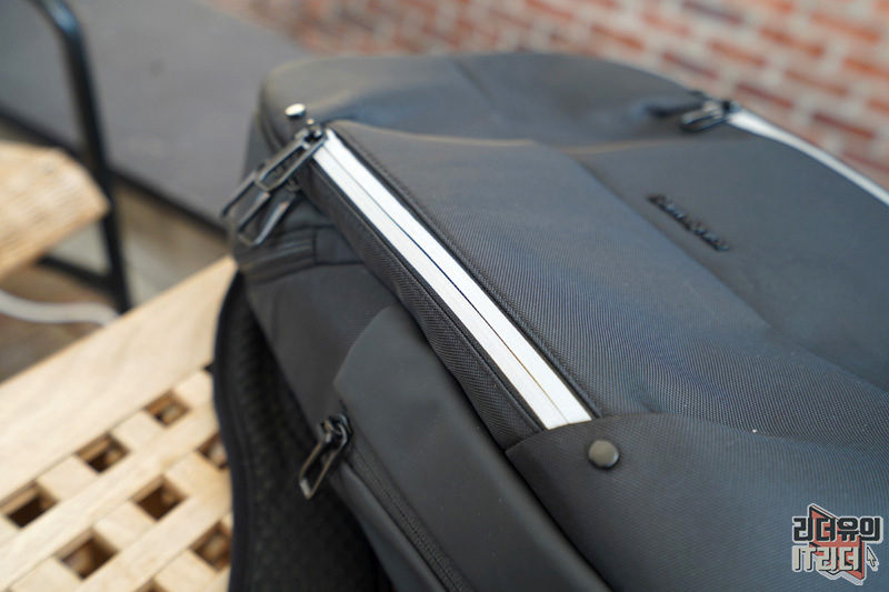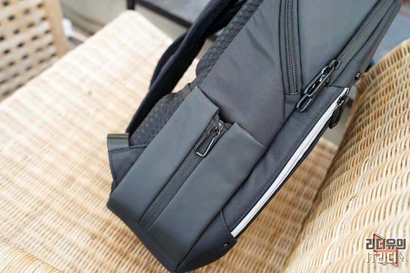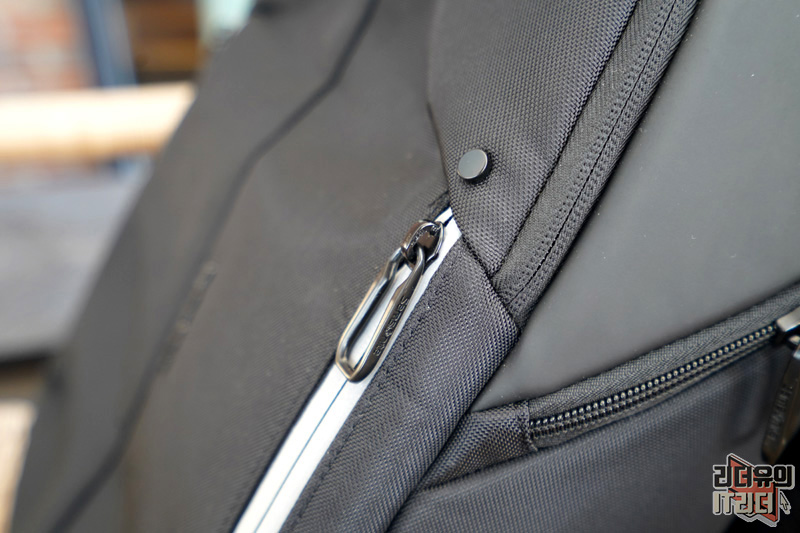 전면에는 지퍼가 양쪽으로 있습니다. 각각의 주머니 공간인데요. 물이 쉽게 유입되지 못하도록 방수처리된 지퍼 라인을 볼 수 있습니다.