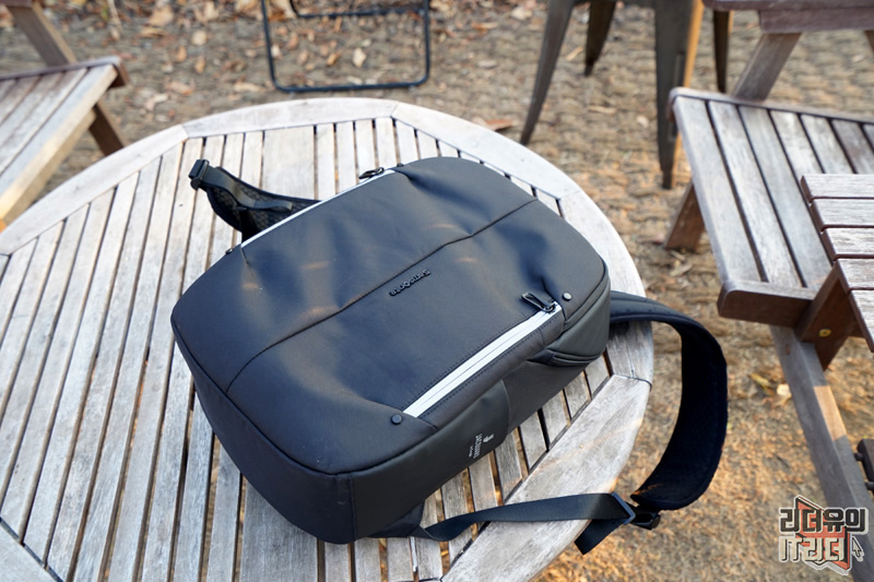 지퍼를 열면 안쪽에 담긴 물건이 살짝 보입니다. 한가지 아쉬운점이 있다면 가방이 활짝 열리지는 않습니다. 그래서 큼지막한 물건을 쉽게 넣고 빼고 할 수는 없습니다. 반면에 가방 틀이 쉽게 흐트러지지 않는 장점은 있습니다.