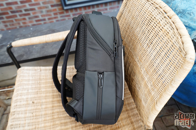 옆을 보면 각이 잡힌 디자인을 볼 수 있습니다. 사이드 지퍼는 가방 메인 공간을 여는 지퍼 입니다.
