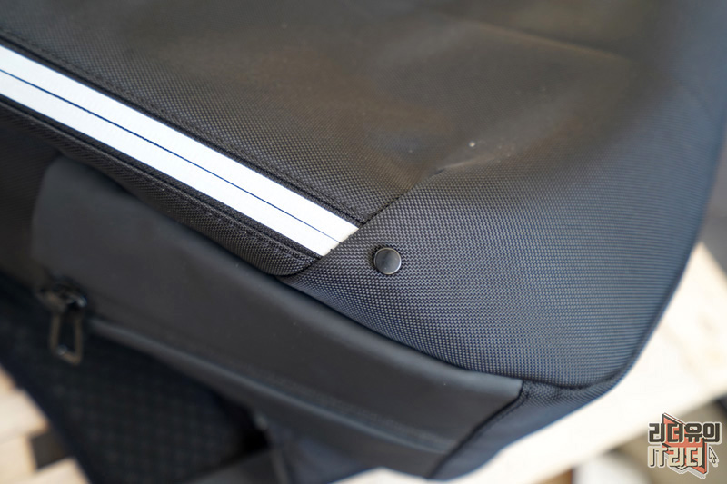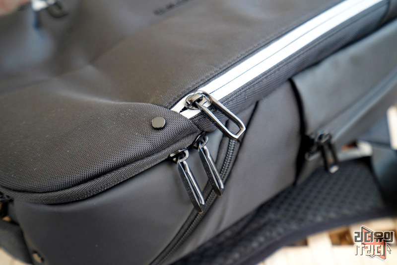 전면에는 지퍼가 양쪽으로 있습니다. 각각의 주머니 공간인데요. 물이 쉽게 유입되지 못하도록 방수처리된 지퍼 라인을 볼 수 있습니다.