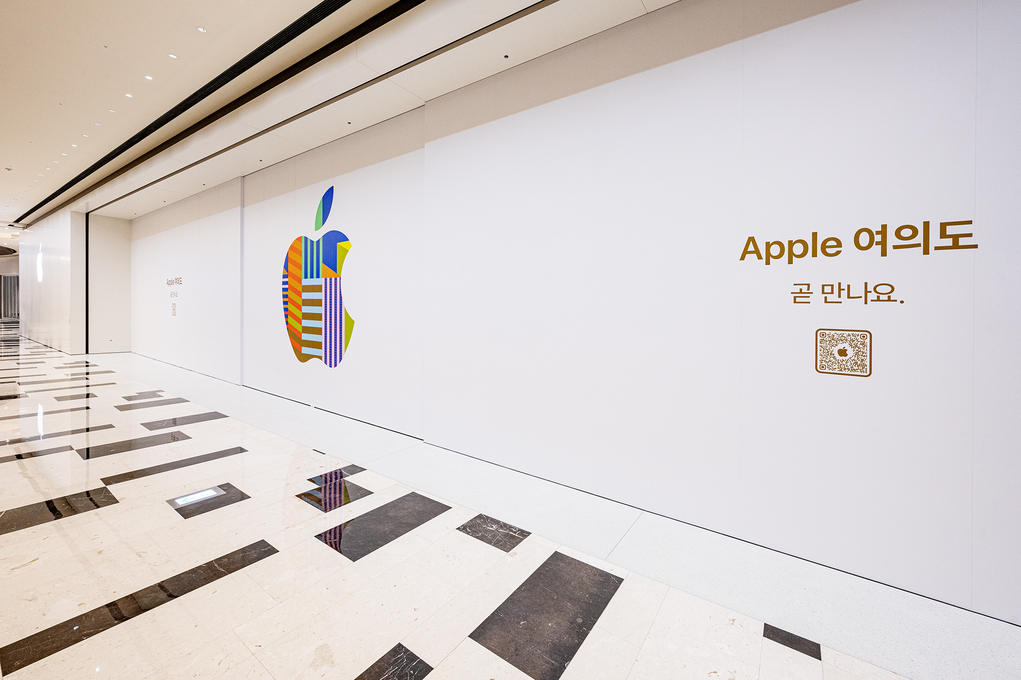 애플스토어 여의도를 가리고 있는 외부 벽에는 QR코드가 있는 것을 알 수 있습니다. 근처에 가시는 분들은 스마트폰으로 QR코드를 찍어 보세요. 애플스토어 여의도만을 위해 준비된 애플 로고와 '곧 만나요' 문구 및 스토어 페이지를 볼 수 있습니다.