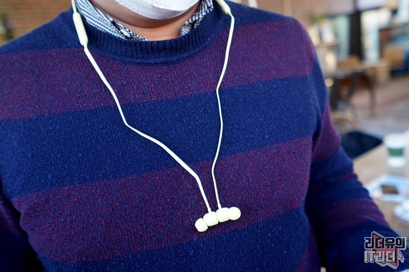 이어폰 헤드 뒤쪽이 자석으로 되어 있어서 붙으면 정지되고 떨어지면 플레이 되는 기능을 보여주고 있습니다. 플레이/정지(통화/종료), 볼륨 조절은 별도의 버튼으로 조작할 수 있습니다.