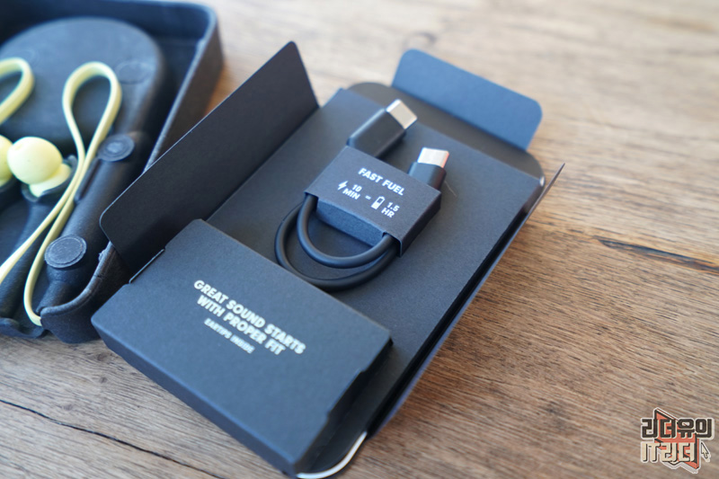 구성품으로 USB-C to USB-C 케이블이 제공됩니다. 고속충전을 지원해 10분만 충전해도 1시간 30분 사용이 가능함을 강조해서 보여주고 있습니다.