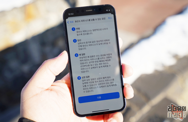 애플이 놀라운 건 특수 장비가 필요했던 최대산소섭취량 파악을 애플워치 하나로 할 수 있게 했다는 것입니다. 그리고 이전에는 꼭 거친 운동을 해야 측정이 되었지만 이번 변화는 평상시처럼 걷기만 해도 측정이 되기 때문에 누구나 가볍게 최대산소섭취량 파악이 가능합니다.