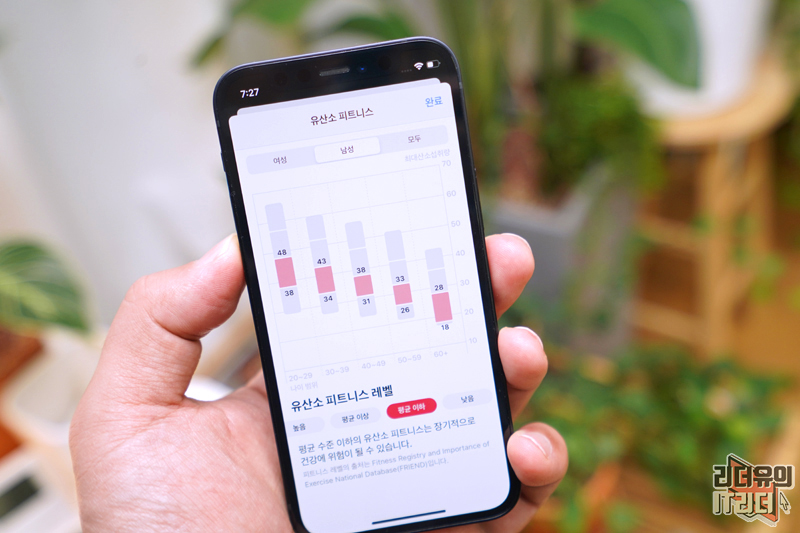 그럼 유산소 피트니스 메뉴에 최대산소섭취량이 나이에 비해 어떤지 평가 점수를 보여주게 됩니다. 높음, 평균 이상, 평균 이하, 낮음으로 구분해서 보여주는데요. 평균 이하 측정값을 받고 나면 관리를 해야 겠다는 자극을 받게 됩니다. 확실한 동기 부여를 해주는 애플워치 입니다.