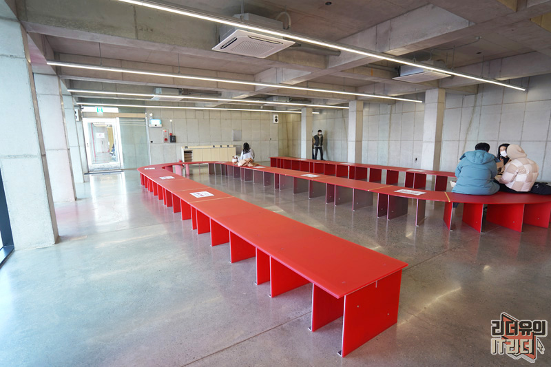 계단을 내려가면 S자 모양으로 꾸며진 자리가 있습니다. 여기서 커피와 빵을 먹고 컴퓨터로 업무도 볼 수 있습니다. 서울과 달리 제주도에서는 실내 카페 이용이 가능했는데요. 거리두기를 통해 서로 붙지 않도록 안내되어 있습니다.