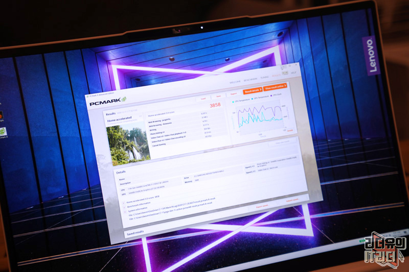 PCMARK 점수는 3858점이나 나왔습니다. 가볍고 슬림한 노트북인데 점수가 꽤 높게 나온 것을 알 수 있습니다.