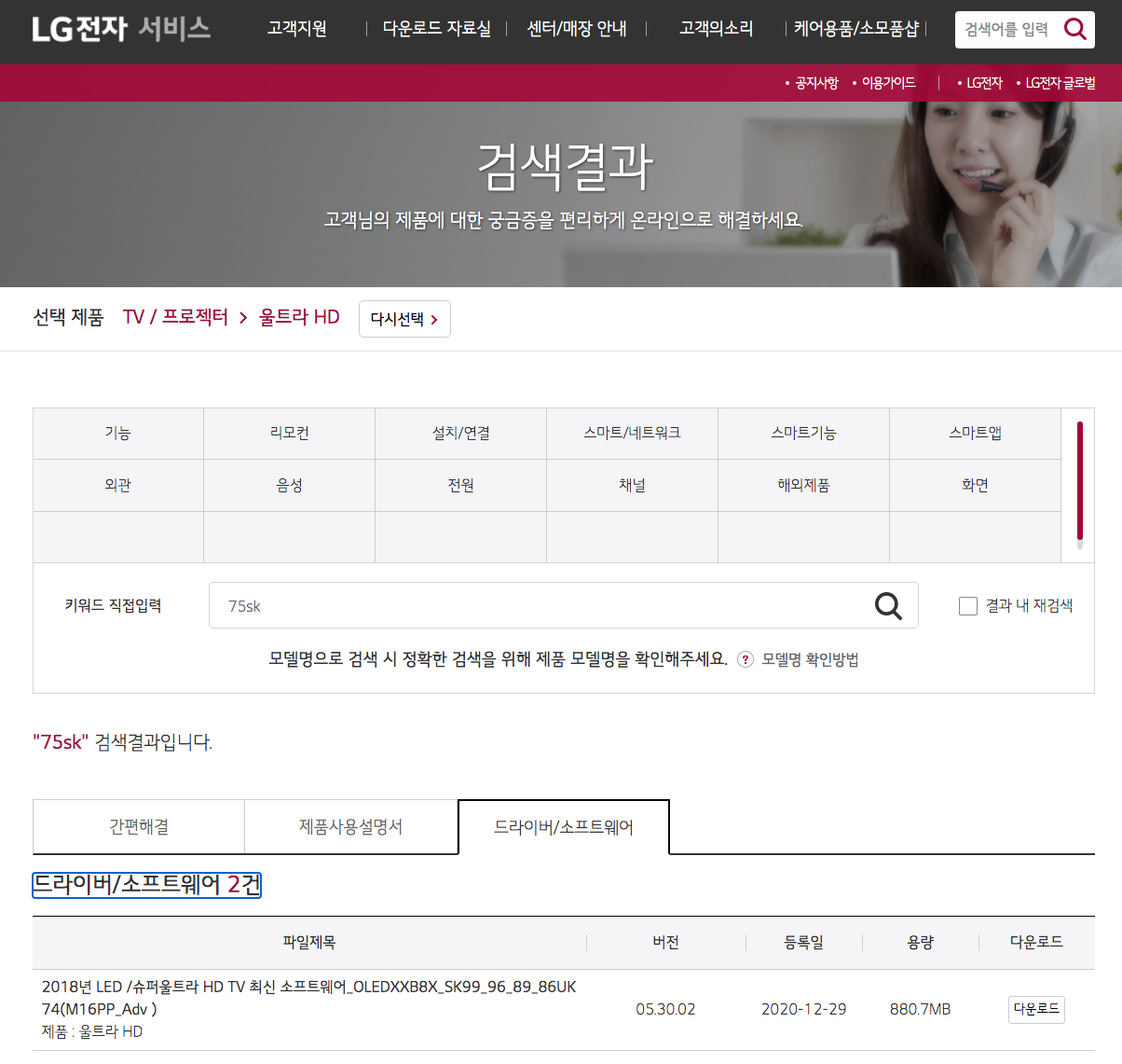 검색 키워드에 TV모델명 앞부분만 넣고 검색을 합니다. 저는 75sk8070 모델이라 75sk만 입력했습니다. 직구 TV의 경우 모델명이 다르기 때문에 앞부분만 검색해야 나오니 참고해 두시기 바랍니다.