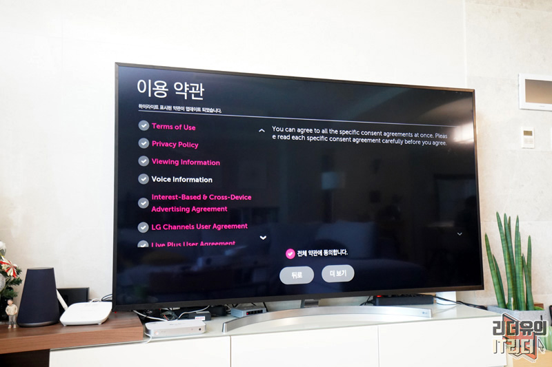 업데이트 후 재부팅이 되면 이용 약관을 체크하라고 나옵니다. 저는 직구 TV라서 영어로 나옵니다. 참고로 직구 TV의 경우 지역을 미국으로 해주셔야 에어플레이 사용이 가능하니 지역은 미국으로 하시고 언어는 한국어로 하시면 됩니다.
