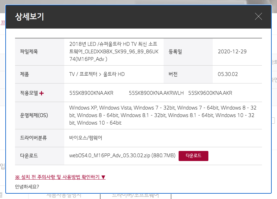 그리고 아래 드라이버/소프트웨어 탭을 누릅니다 그럼 2018년 LED/슈퍼울트라 HD TV 최신 소프트웨어가 있습니다. 버전은 05.30.02 입니다.