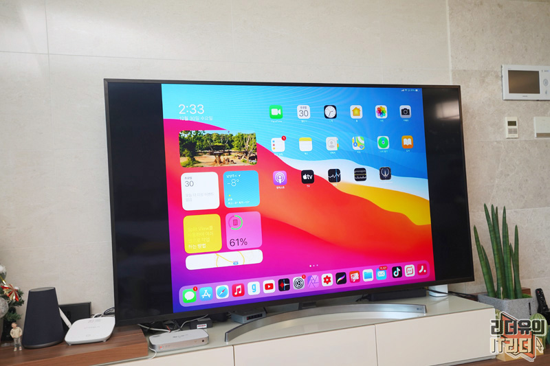 아이패드를 에어플레이로 연결한 모습입니다. 아이패드 화면이 그대로 나오는 것을 알 수 있습니다. 아이패드 화면도 와이드한 화면이 아니라서 사이드 부분은 잘려서 나옵니다.