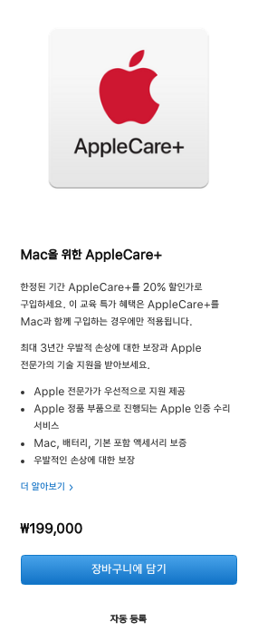 추가로 애플케어 플러스도 20% 할인가로 구매가 가능합니다. 애플 M1 칩 맥북에어의 경우 249,000원이지만 학생 할인으로 199,000원에 구매가 가능합니다. 애플 기기 사용할때는 애플케어 플러스는 필수라 할 수 있는데요. 우발적인 손상에도 저렴한 수리비로 고칠 수 있어 더 안심하고 사용할 수 있는 보험과 같은 옵션입니다.