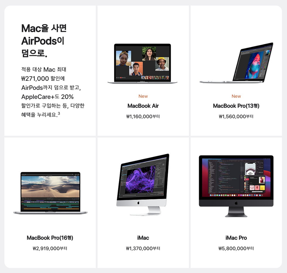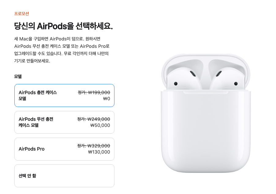 이번 프로모션의 핵심은 맥을 사면 에어팟을 서비스로 준다는 것입니다. 대박 혜택이죠? 물론 기본 에어팟 보다 에어팟 프로를 받고 싶은 분들도 있겠죠? 추가금을 내면 받을 수 있는 헤택도 제공하니 원하는대로 받으면 되겠습니다.