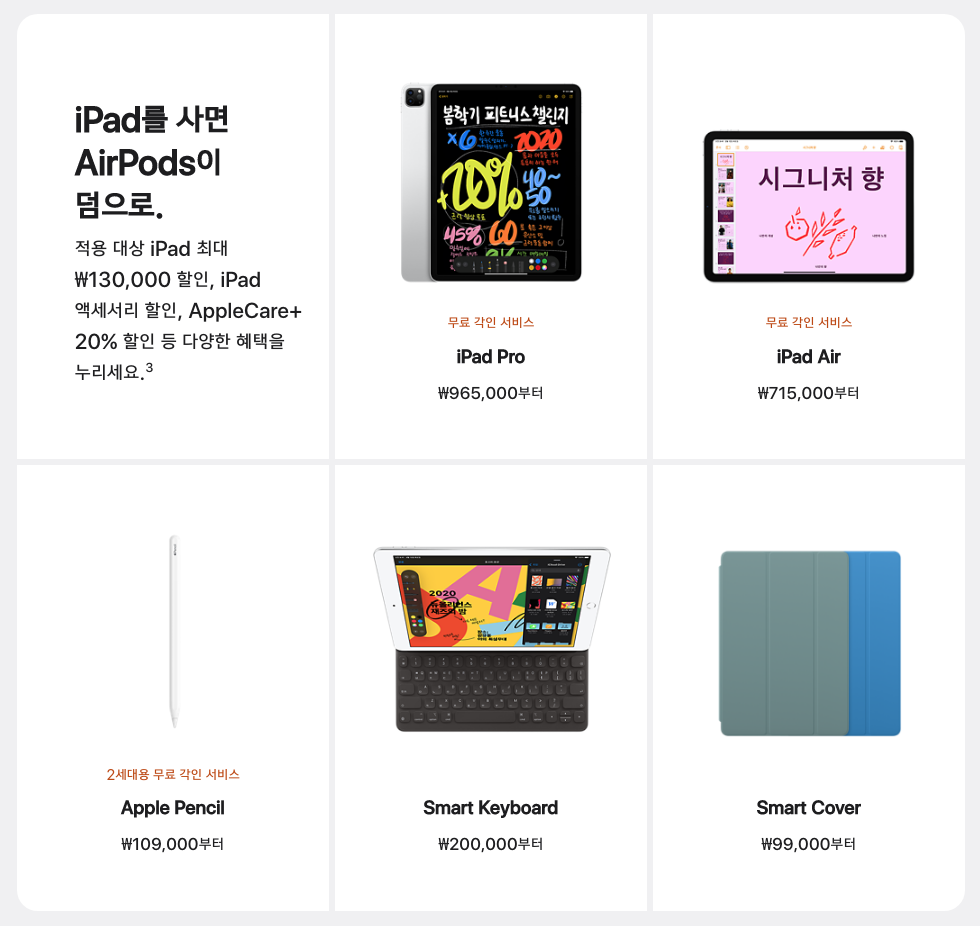 아이패드도 기기에 따라 최대 13만원 할인 헤택과 애플케어 플러스 20% 할인이 주어지니 애플 학생 할인을 잘 이용하면 좋습니다.