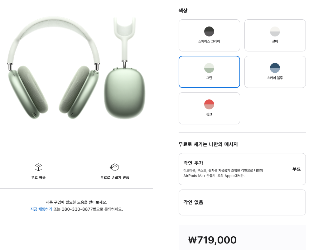 에어팟 맥스는 5가지 색상이 있습니다. 스페이스 그레이, 실버, 그린, 스카이 블루, 핑크 입니다. 가격은 719,000원입니다. 비싼 가격이라 생각할 수 있지만 헤드폰 가격은 이미 유명 브랜드는 이것 보다 더 고가입니다. 그래서 크게 비싼 수준은 아니니 소리와 사용성으로 평가를 받을거라 생각됩니다.