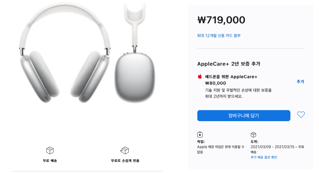 현재 온라인 애플스토어 주문을 보면 배송 받으려면 8~10주가 소요되거나 3월달에 배송 받을 수 있다는 걸 알 수 있습니다. 해외처럼 국내에서도 에어팟 맥스 품귀현상이 벌어지고 있습니다.