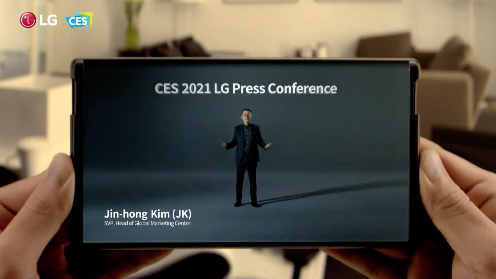 LG 온라인 프레스 컨퍼런스에서 보여준 LG 롤러블폰 속 발표 하는 모습입니다
