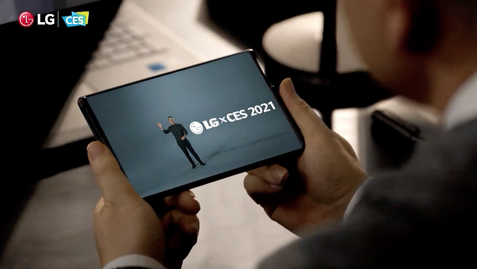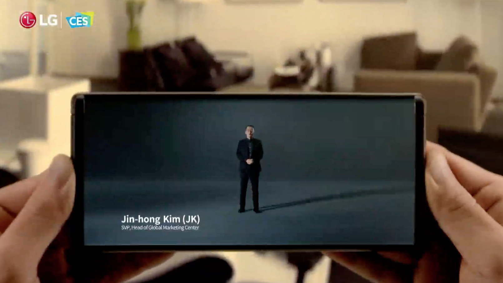 LG 온라인 프레스 컨퍼런스에서 보여준 LG 롤러블폰 속 발표 하는 모습입니다