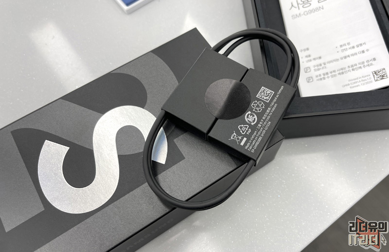 갤럭시S21 울트라 구성품은 USB-C to C 케이블만 제공됩니다. 기존 처럼 촘촘하게 구성품이 제공되지 않으니 여유롭게 말아 둔 것을 알 수 있습니다.