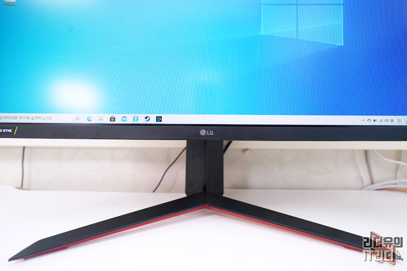 스탠드는 V자로 날렵하게 디자인 된 것이 특징입니다. 독특하게 가운데 부분이 뜨게 되어 있는데요. 그 밑으로 레드 컬러 포인트를 넣어 입체적인 디자인을 강조하고 있습니다.