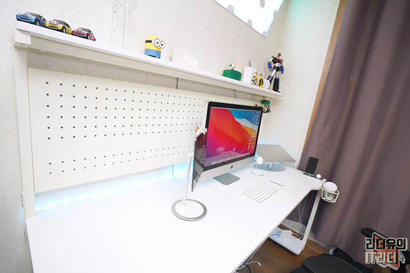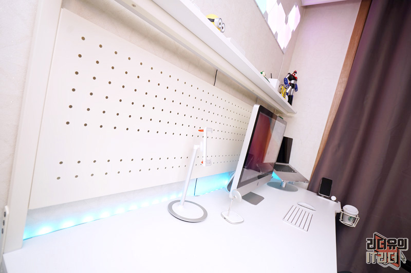 또한 타공판이 뒤쪽에 넓게 자리잡고 있어 얼마든지 다양한 거치와 꾸미기를 할 수 있습니다. 타공판을 달기 위해 벽에 못을 박아야 하나 생각하셨던 분들 많을텐데 제로스테이션 타워는 그럴 필요 없습니다. 책상 일체형 구조라 깔끔하고 쉽게 활용이 가능합니다.