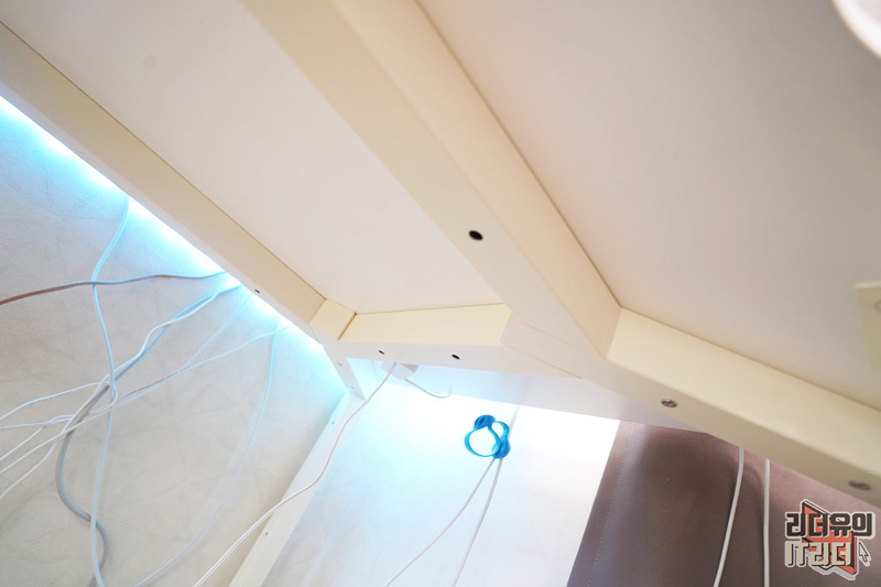다면접촉 결합방식으로 서로를 엮어 미동도 없는 완벽한 지지를 하게 됩니다. 비틀림 감성 관련 부위는 40 x 40mm의 사각 파이프를 적용해 더욱 단단하게 잡아줍니다. 제가 LED 조명 때문에 책상 위를 밟고 올라갔는데 너무나 안정적이라서 깜짝 놀랐습니다.