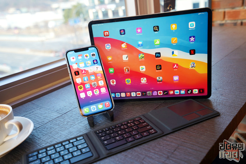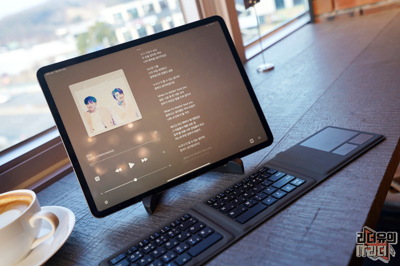 아이패드 프로 4세대 12.9인치와 조합해 노트북 처럼 사용하는 센스! 일반적인 키보드에 비해 입력이 불편할 수는 있지만 나름 편한 사용을 할 수 있습니다.