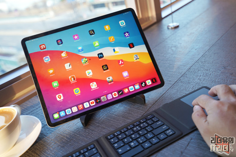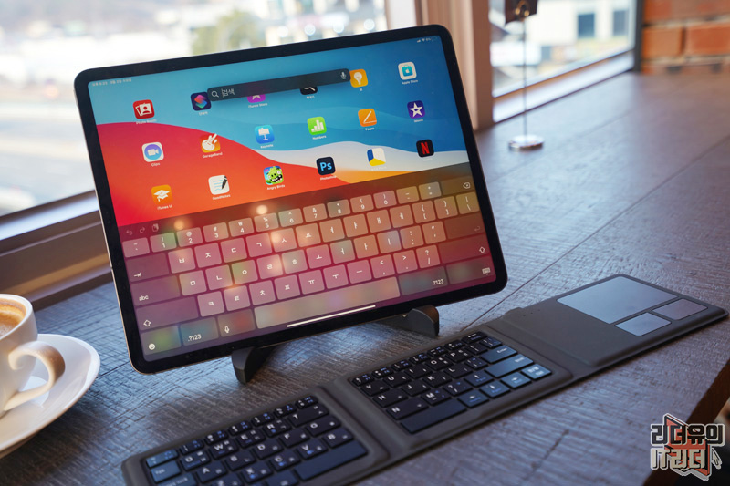 아이패드 프로 4세대 12.9인치와 조합해 노트북 처럼 사용하는 센스! 일반적인 키보드에 비해 입력이 불편할 수는 있지만 나름 편한 사용을 할 수 있습니다.