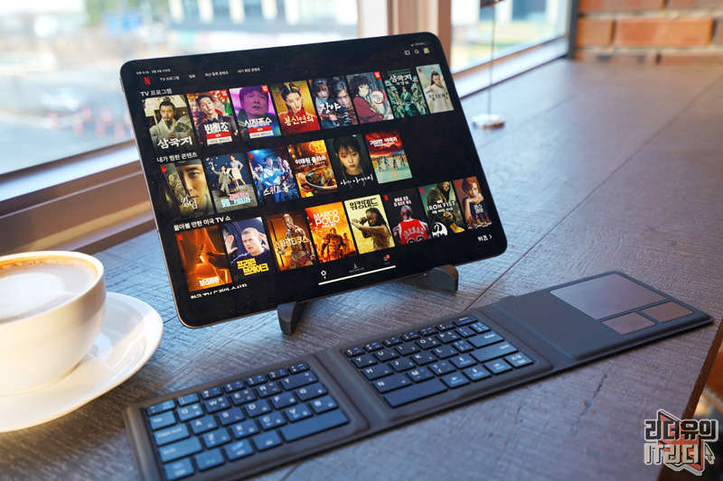 아이패드 프로 4세대 12.9인치와 조합해 노트북 처럼 사용하는 센스! 일반적인 키보드에 비해 입력이 불편할 수는 있지만 나름 편한 사용을 할 수 있습니다.
