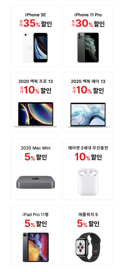 애플 세일은 아이폰SE 2세대는 최대 35% 할인, 아이폰 11 프로는 최대 30% 할인을 합니다. 맥북프로, 맥북에어, 맥미니, 에어팟, 아이패드 프로 애플워치5까지 다 할인을 하는데요. 다른 품목들은 가격차이가 크지는 않지만 그래도 할인을 해주는 부분이니 잘 고민해서 선택하시면 됩니다.